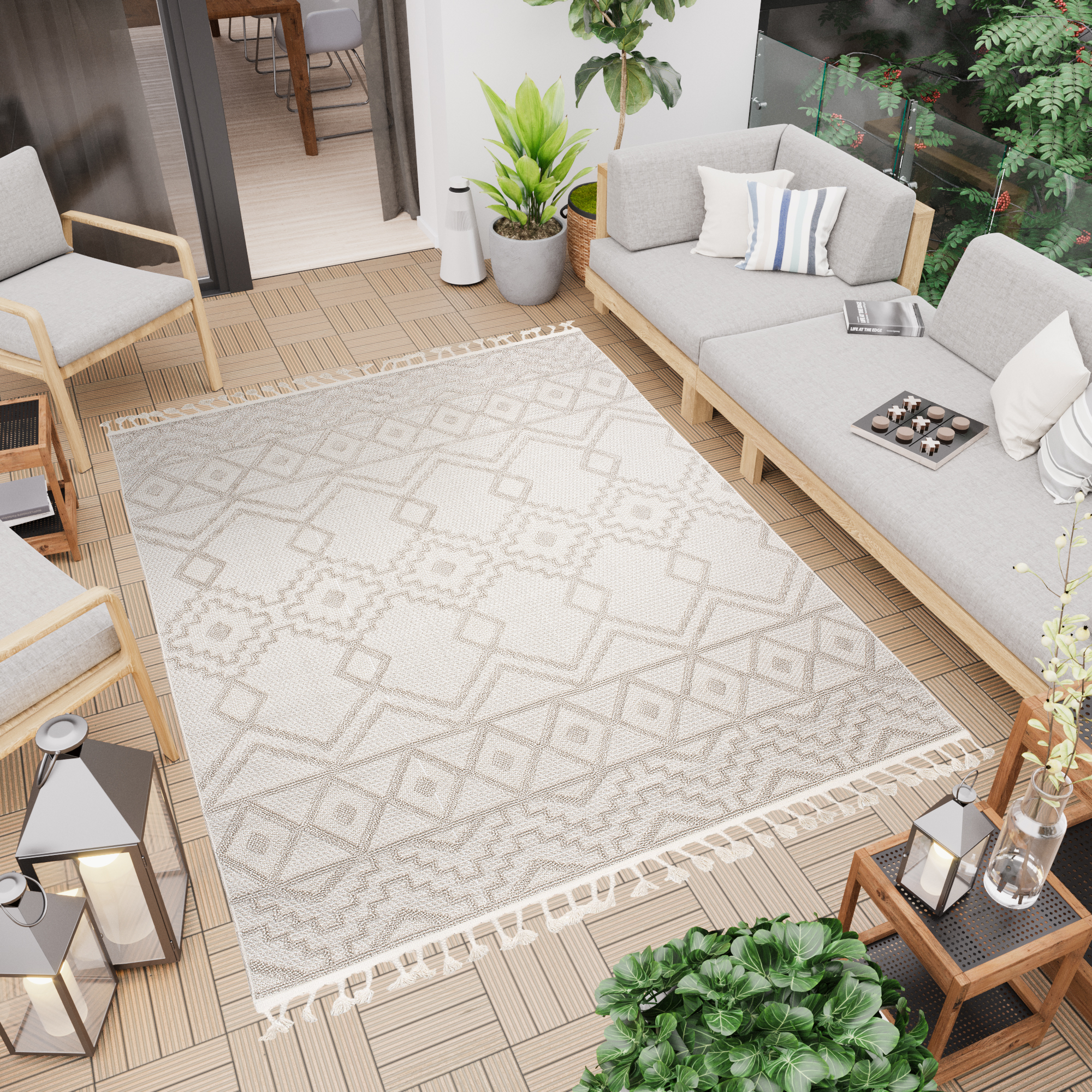 Timber Indoor– und Outdoor-Teppichkollektion ist die perfekte Kombination aus Stil und Funktionalität! Diese aus hochwertigen Materialien hergestellten Teppiche sind so konzipiert, dass sie sowohl innerhalb als auch außerhalb des Hauses verwendet werden können. Timber Kollektion verfügt über eine warme und einladende beige Farbe, die mühelos jeden Einrichtungsstil ergänzt. Eines der herausragenden Merkmale dieser Teppichkollektion sind die Fransen, die jedem Raum einen Hauch von Textur und Charakter verleihen. Die Fransen bieten auch ein lustiges Element, das perfekt ist, um eine entspannte Atmosphäre in Ihrem Zuhause zu schaffen.